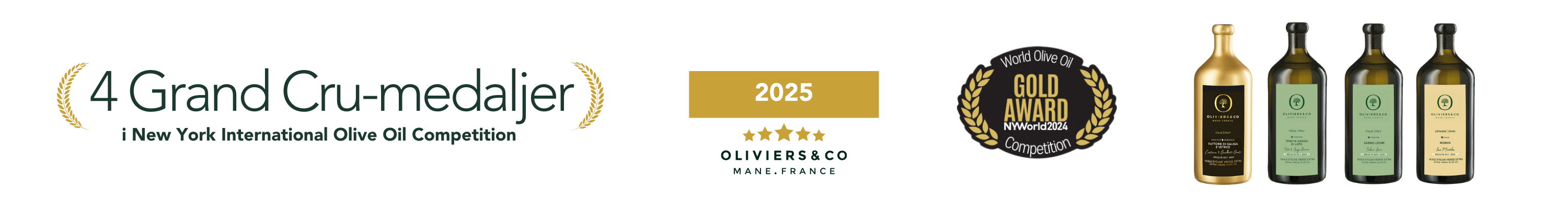 Oliviers & Co mottok i 2025 4 gullmedaljer for 4 Grands Crus: Sabino Leone (Italia), Monva (Spania), Ganga Di Lupo (Italia), og Galiga E Vetrice (Rameaux d'Or, Toscana).