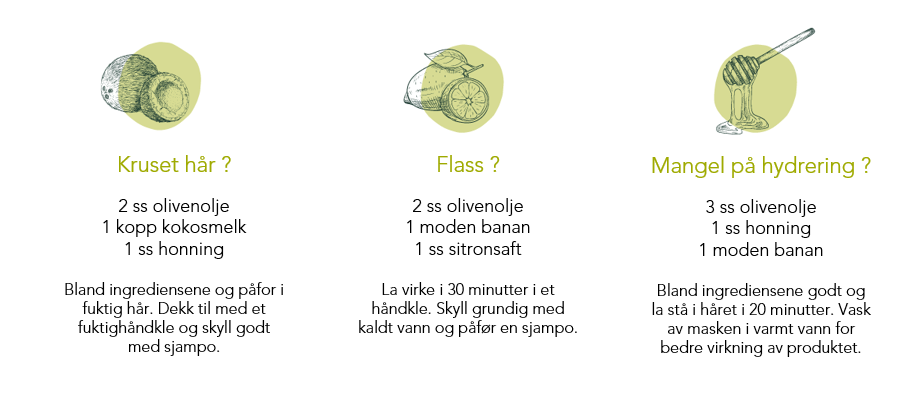 Olivenolje løser mange typer problemer med håret ditt. Faktisk bidrar det til å fremme hårvekst, gjør det blankere, det hjelper til med å reparere ødelagte tupper, redusere krusing og berolige sensitiv og kløende hodebunn! Olivenolje bidrar slik at du får hjelp til ulike områder av hårpleie! Når du innarbeider olivenolje i hårrutinen din, vil du se en forskjell før og etter.