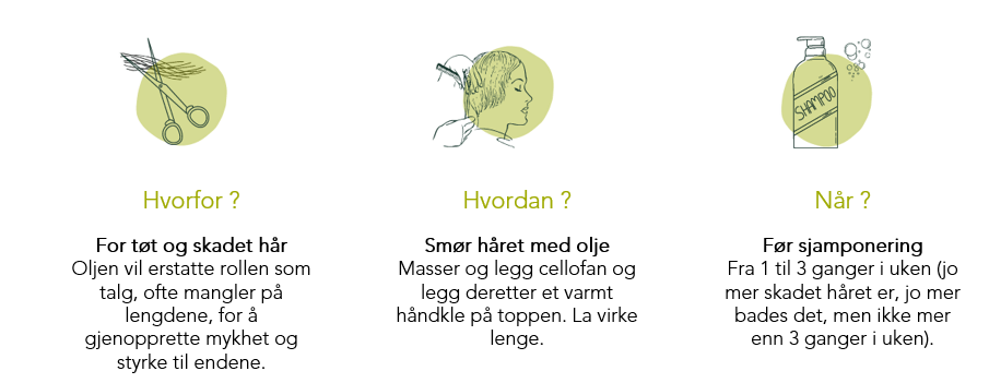 Vi anbefaler at du påfører oljen en gang i uken direkte i tørt hår for å forhindre at vann danner en beskyttende barriere. Masser håret forsiktig fra tuppene til hodebunnen for å suge inn oljen. Pakk dem inn i et håndkle og la det virke i en til to timer. Skyll deretter med rent vann før sjamponering.
