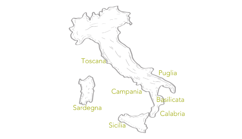 Kulturen rundt olivenolje finnes i hele Italia. Men Puglia, Calabria, Basilicata, Sardinia og Sicilia er de viktigste regionene for olivenoljeproduksjon i Italia. De står for 85% av landets produksjon. Toscana regnes som regionen som produserer de beste olivenoljene i verden. Lær mer om olivenolje fra Toscana.