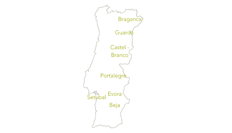 Olivendyrking i Portugal er utbredt i den nordlige delen med distriktene Bragança, Guarda, Castel Branco, Tràs-os-Montes og den sørlige delen med distriktene Portalegre, Evora, Setùbal og Beja som avgrenser Alentejo-regionen.